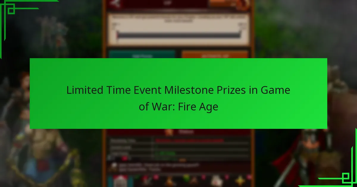 Limited Time Event Milestone Prizes in Game of War: Fire Age offer players the opportunity to earn valuable rewards by completing specific objectives during special events. These prizes can significantly enhance gameplay, providing essential resources and powerful items that improve a player’s performance. To maximize achievements, players should focus on strategic planning and effective resource management throughout the event. Key sections in the article: Toggle What are Limited Time Event Milestone Prizes in Game of War Fire Age? Definition and purpose of milestone prizes Duration and schedule of the event Integration with overall gameplay mechanics Eligibility criteria for participation Common…